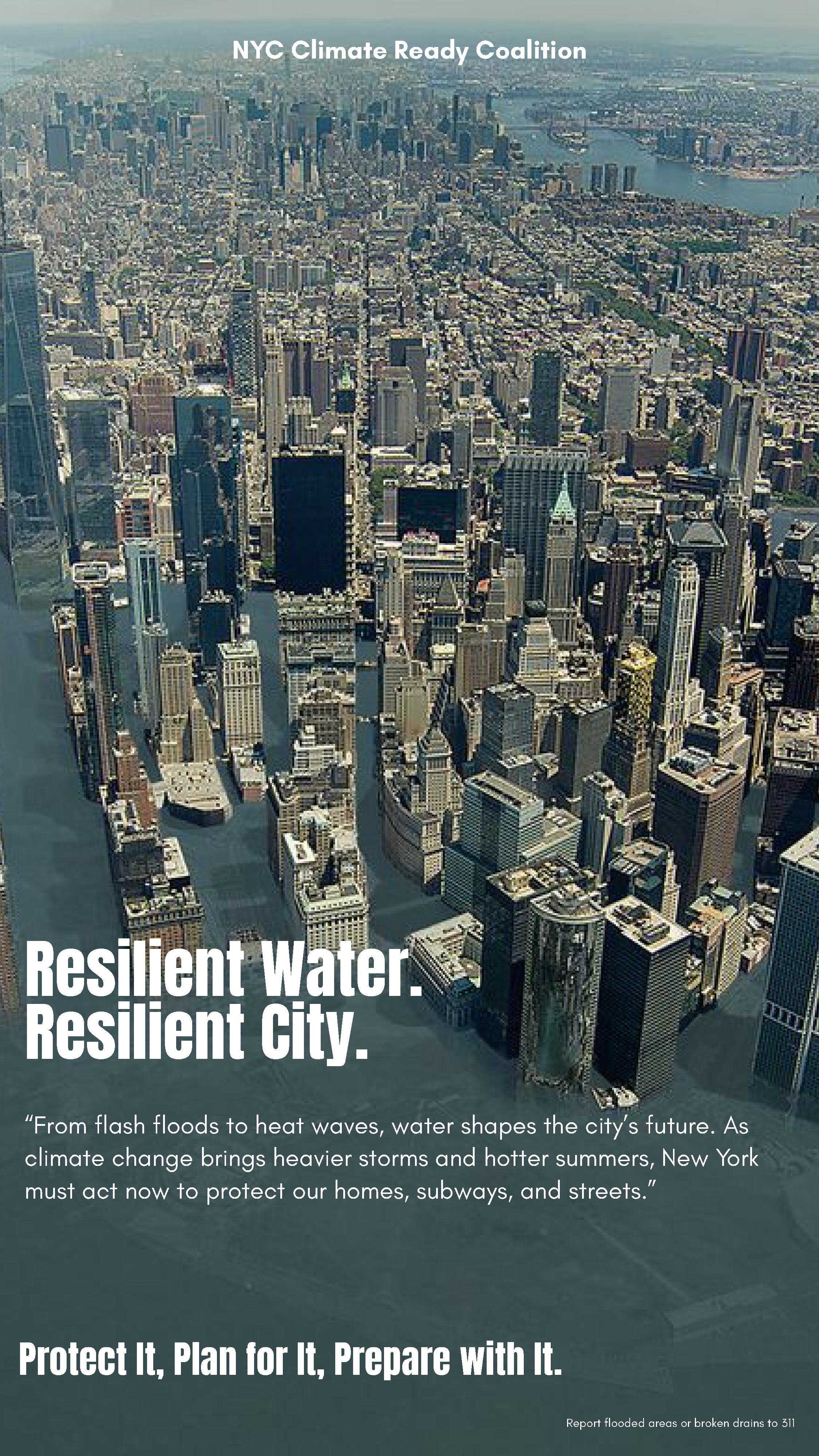 Lily Nelson | Resilient Water. Resilient City: “For my PSA campaign, I chose to frame it around how water plays a powerful and ever-changing role in shaping New York’s future. From flash floods to heat waves, the city’s relationship with water reflects the urgent needs and challenges of climate change. I wanted to highlight how extreme weather events are no longer distant possibilities; they are daily realities that threaten New Yorkers' homes, subways, and streets. This campaign encourages New Yorkers to take action by protecting, planning for, and preparing with water in mind. Titling my PSA 'Resilient Water. Resilient City.' I wanted to spread the community's awareness and resilience. The overall goal being to inspire collective responsibility in building a city that can adapt and thrive in the face of climate uncertainty.”